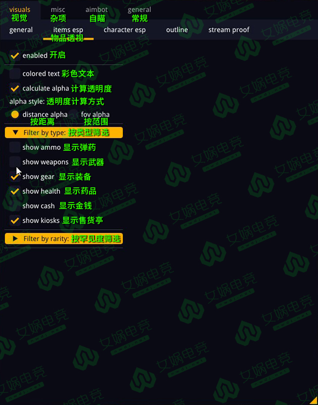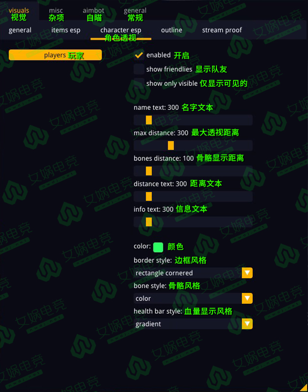 骨骼透视、方框透视、血量显示,队友显示透视距离可调